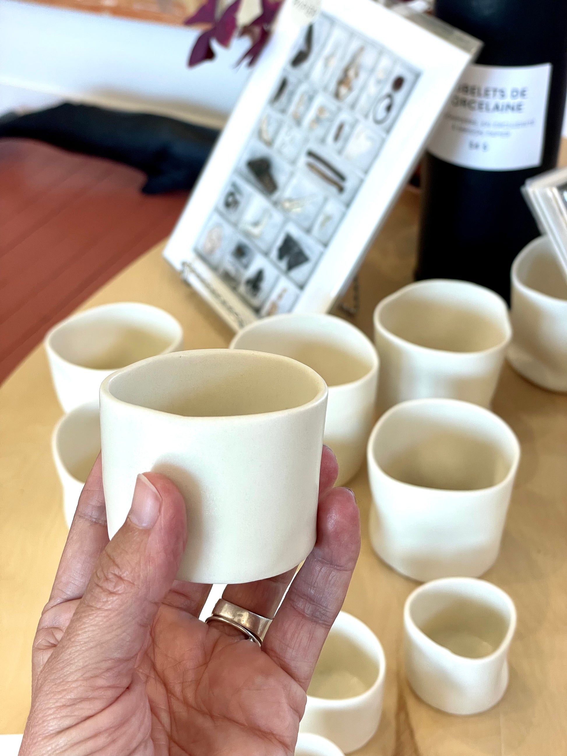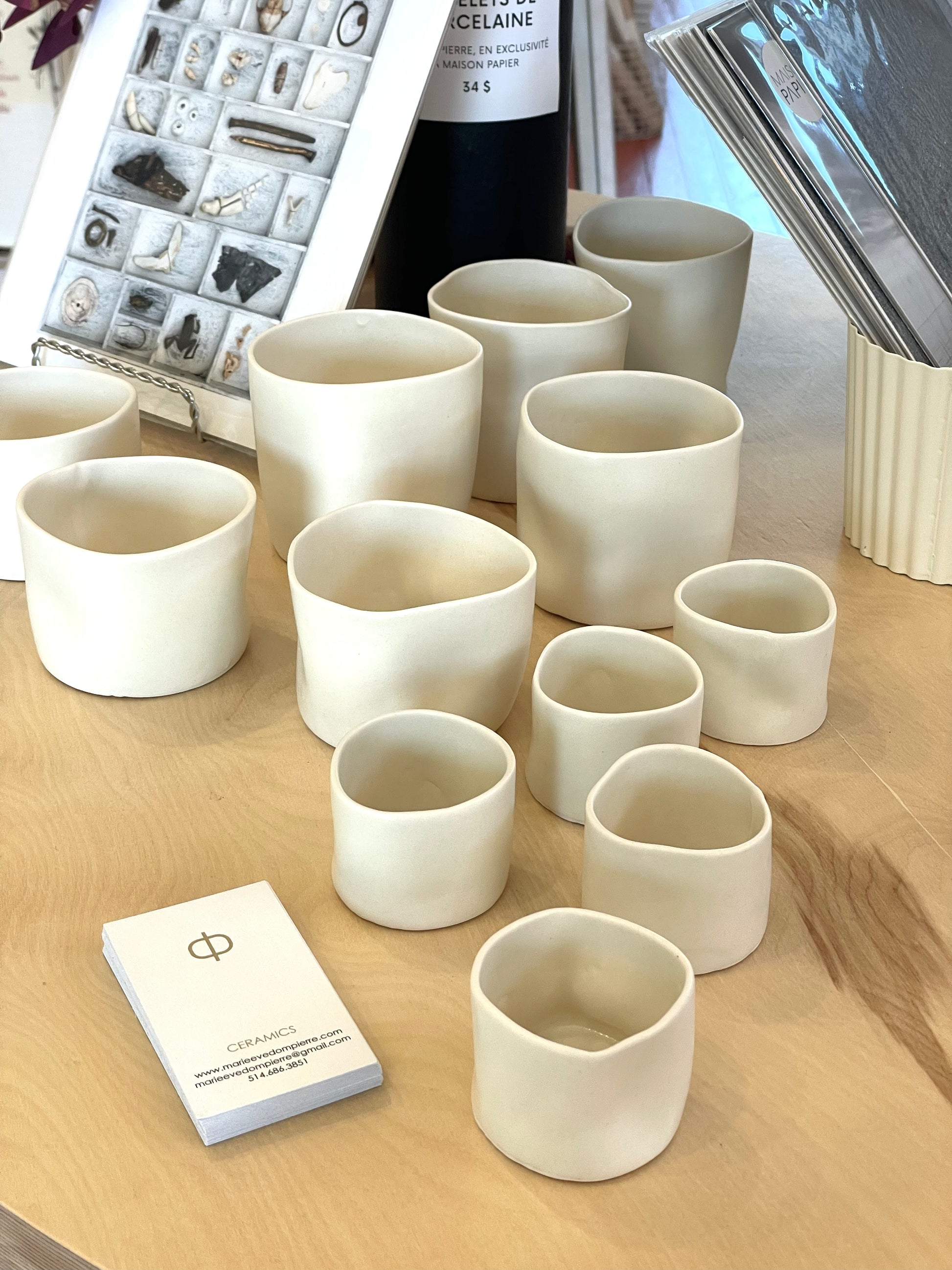 Ces gobelets de porcelaine ultra fins évoquent le papier froissé. Imaginés pour faire écho aux reproductions sur papier beaux-arts d'oeuvres d'artistes des Îles de la Madeleine. Créés par Dompierre, en exclusivité pour Maison Papier.